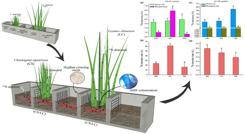 上述成果分别以“Interplant transfer of nitrogen between C3 and C4 plants through common mycorrhizal networks under different nitrogen availability”“Differential response of mycorrhizal fungi linked with two dominant plant species of temperate grassland under varying levels of N-addition”“Potential role of common mycorrhizal networks in improving plant growth and soil physicochemical properties under varying nitrogen levels in a grassland ecosystem”“Formation of common mycorrhizal networks significantly affects plant biomass and soil properties of the neighboring plants under various nitrogen levels”为题,于近期发表在Applied Soil Ecology、Journal of Plant Ecology、Global Ecology and Conservation和Microorganisms等期刊上。