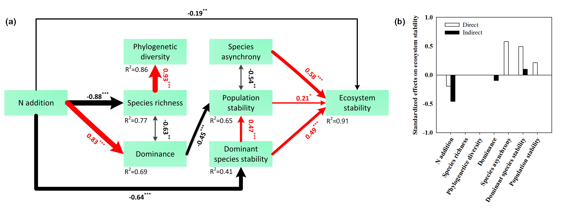 图1:氮添加影响生态系统稳定性的结构方程模型 (a) 和每个变量的标准化效应 (b)