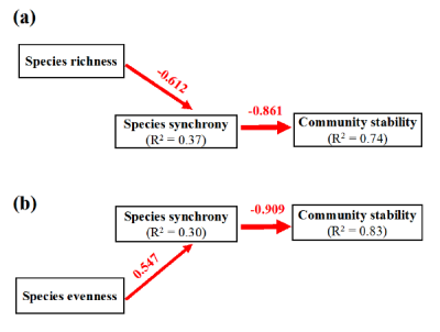 北极冻原非维管植物群落的时间稳定性在自然条件(a)和增温条件(b)下的影响因素结构方程模型