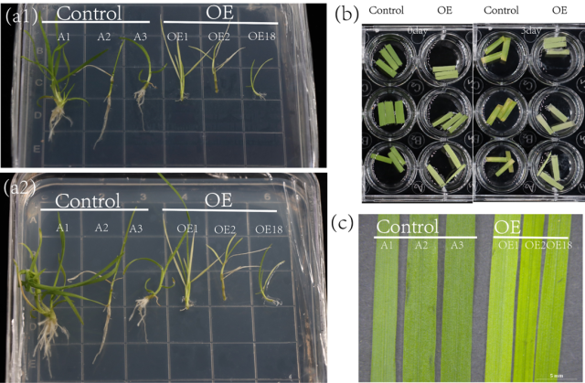 近期,草业与草原学院研究团队通过在匍匐翦股颖中异源表达 NOL 基因,对其功能开展了深入研究,取得了阶段性进展。研究发现, ZjNOL 在匍匐翦股颖中的表达导致转基因植株叶片发黄、叶片表层变厚和维管变小。此外,转基因植物表现出叶绿体结构的形态学改变,叶绿体内类囊体数量显著减少。进一步研究 ZjNOL 的特性功能与叶绿素的降解机制,揭示草坪草的衰老机理,将对延长草坪草绿期、促进草坪草遗传改良具有重要意义。