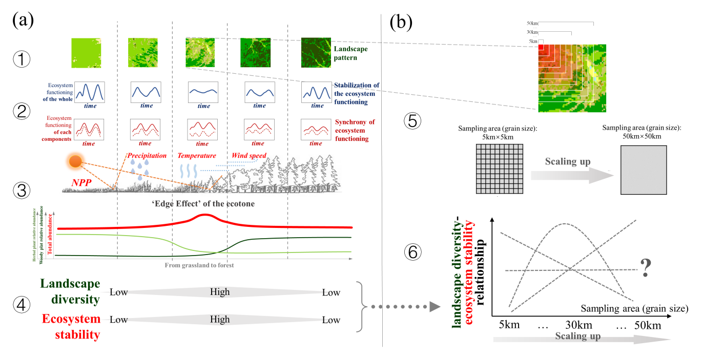 该研究以我国北方大兴安岭-呼伦贝尔草原、大兴安岭-阿尔山-科尔沁草原和太行-燕山-克什克腾草原构成的北方林草过渡带为研究区域,利用土地利用覆被变化数据、气象观测资料和初级生产力遥感反演数据,在景观水平上,以香农-威纳景观多样性指数作为指征生态系统类型多样性的量化指标,选择区域生态系统气候要素气温、风速、降水以及植被净初级生产力空间数据集,利用对应多年份的时间序列波动信息计算其稳定性,设置不同统计采样的粒度大小,即由5km分辨率到50km分辨率,探究空间多尺度扩展下,景观多样性与生态系统气候要素及生产力功能稳定性之间关系。