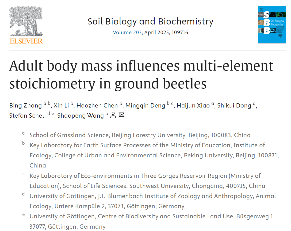 近日,草业与草原学院青年教师张兵为第一作者的论文“Adult body mass influences multi-element stoichiometry in ground beetles”发表于中科院一区土壤生态学权威期刊《Soil Biology and Biochemistry》(IF=9.8)。该研究针对体重大小和环境生境如何影响甲虫成虫的化学元素组成等问题,分析了北京东灵山四种森林类型中三种捕食性土壤动物步甲(昆虫纲鞘翅目)的十一种化学元素(碳、氮、磷、硫、钾、钙、钠、镁、锌、锰、铜)的含量,探讨了个体大小(体重)和生境对体内化学计量特征的影响。