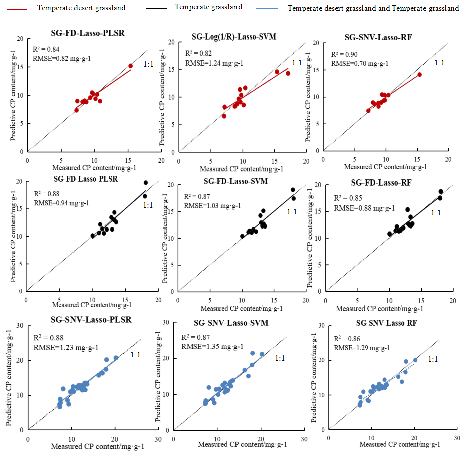 本研究构建了54种包括不同草地类型和合并样本的机器学习模型,通过地面实测样本的精度检验,最优模型的R²值在0.82-0.90之间,RMSE值在0.70-1.29 mg·g-1之间(图3),模型表现出较好的预测性能,能够准确地反演天然牧草CP含量。本研究提出了一种天然牧草营养成分快速监测技术,相关结果对于智慧牧场建设和管理、草原保护修复等都具有重要参考价值。