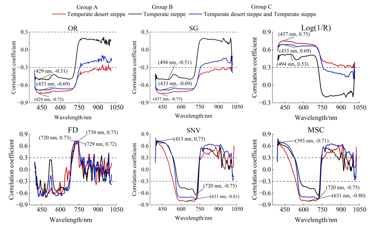 为了提升无人机高光谱数据与CP含量的相关性,研究中将不同高光谱数据的预处理方法进行了对比分析。研究表明,与OR波段相比,FD、SNV和MSC方法有助于提高敏感波段与CP含量的相关性(图2)