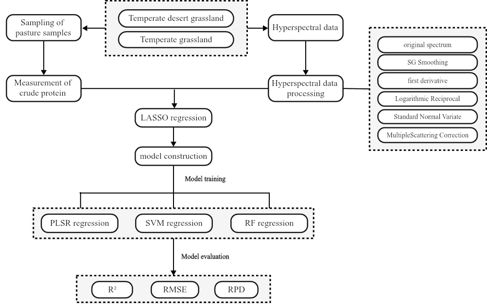 粗蛋白(Crude Protein, CP)含量是衡量牧草营养价值的重要指标。牧草CP的准确监测对于草地退化评价、草地分等定级和畜牧业高质量发展具有重要意义。传统的CP含量监测通常是实地采样后采用化学实验方法获取,该方法耗时耗力、成本高,而且采样区域具有单一性。本研究利用高光谱无人机航拍数据和地面实测数据,在高光谱数据预处理方法比较的基础上,使用最小绝对值收缩和选择算子(Lasso)回归来筛选敏感波段,并采用了三种机器学习算法分别构建了不同草地类型(温性荒漠草原和温性草原)的单独样本以及合并样本的天然牧草CP含量遥感估测模型(图1)。