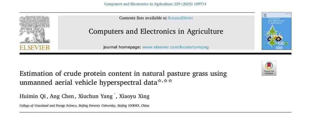 近日,草业与草原学院杨秀春教授课题组在工程技术领域一区TOP期刊《Computers and Electronics in Agriculture》(IF=7.7)上发表论文“Estimation of crude protein content in natural pasture grass using unmanned aerial vehicle hyperspectral data”。