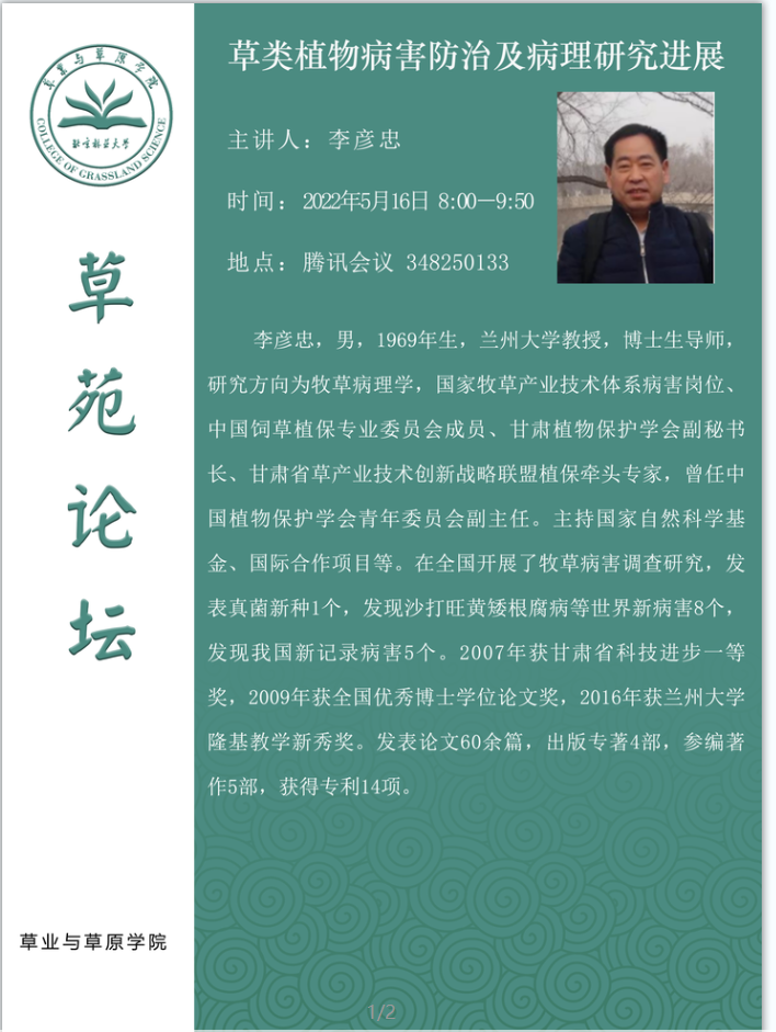 » 草苑论坛——草类植物病害防治及病理研究进展