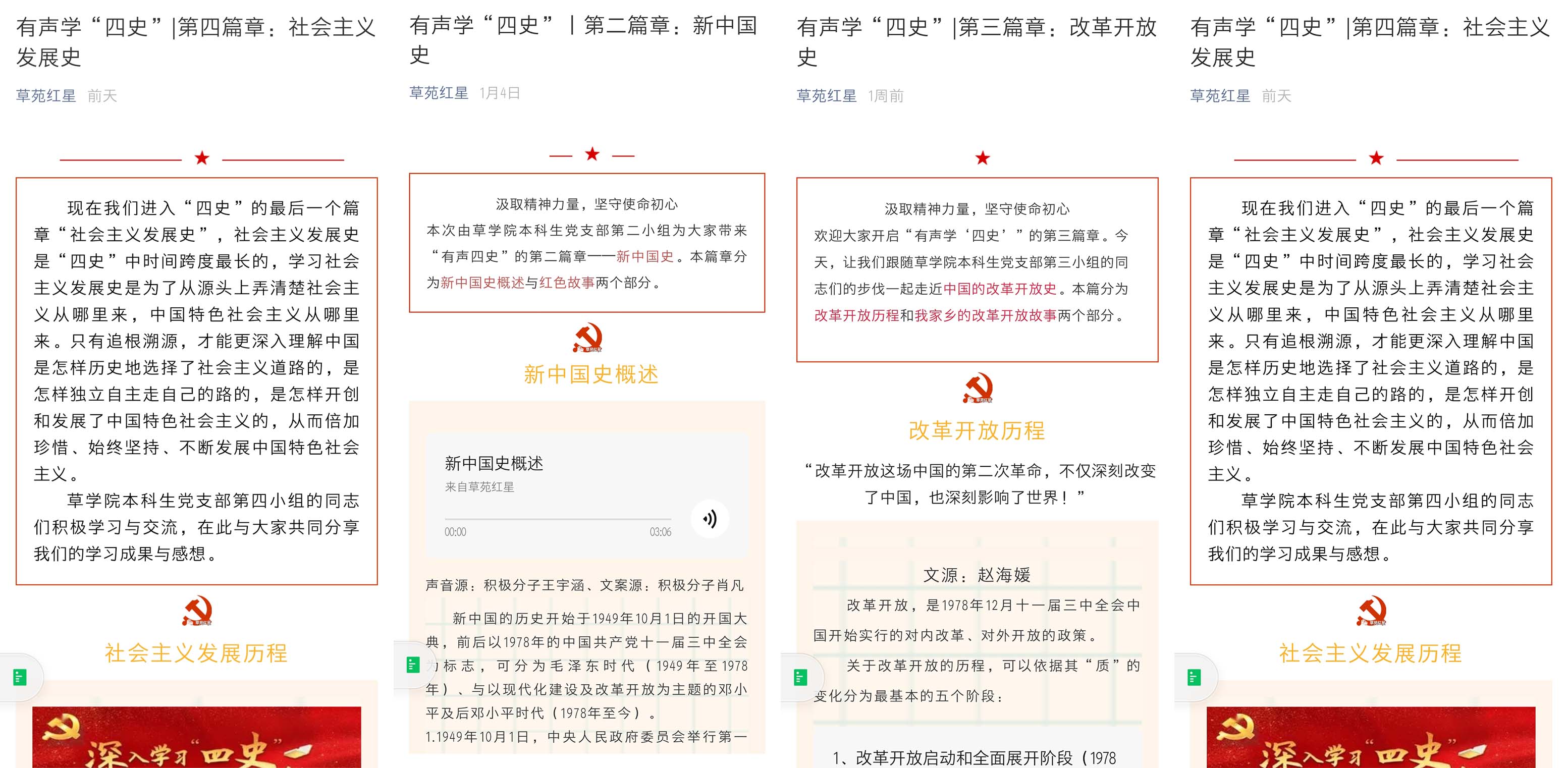 近日,学院本科生党支部开创“有声学四史”系列活动,全体党员及入党积极分子选读四史章节,选取精彩片段录音展出,以朗诵方式帮助同学们了解“四史”,用声音魅力促使同学们牢记“四史”。